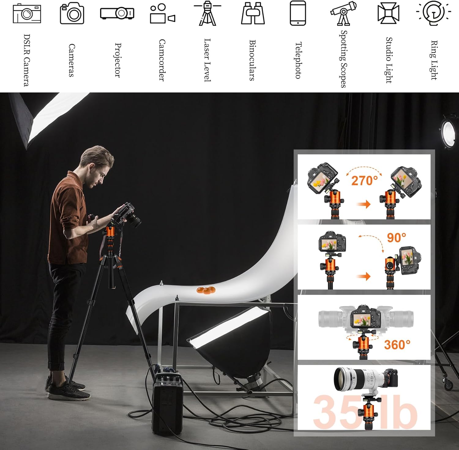 Designed to support a payload of up to 35lb, this professional tripod is compatible with binoculars, spotting scopes, and telescopes, making it a complete solution for all your photography and videography needs. Its sturdy construction ensures that your equipment remains secure and steady, allowing you to focus on capturing the perfect shot.